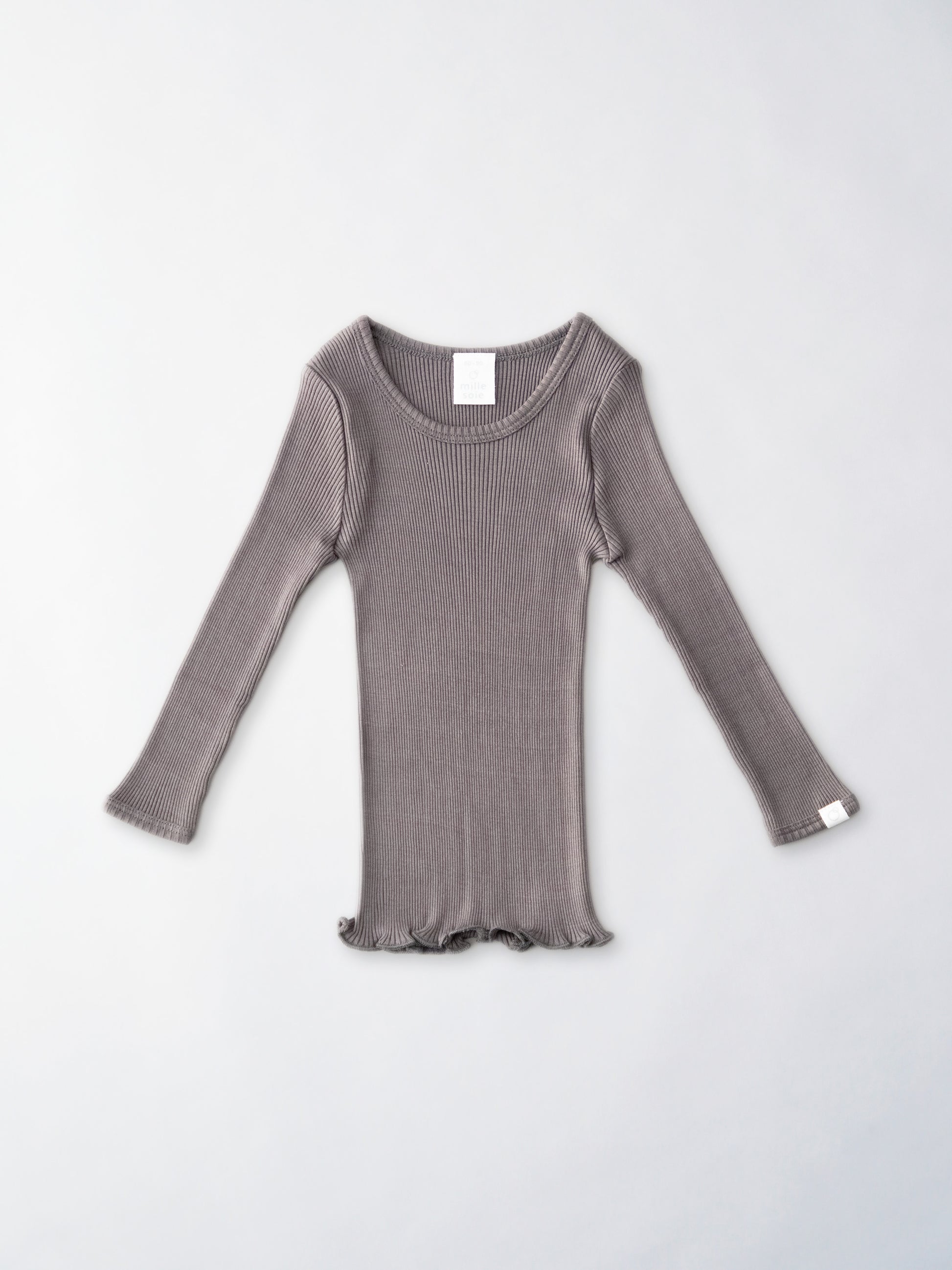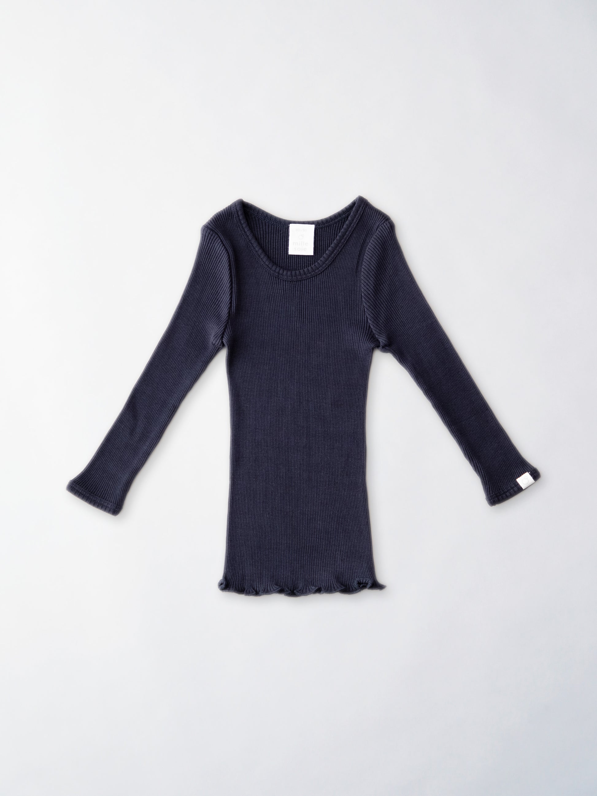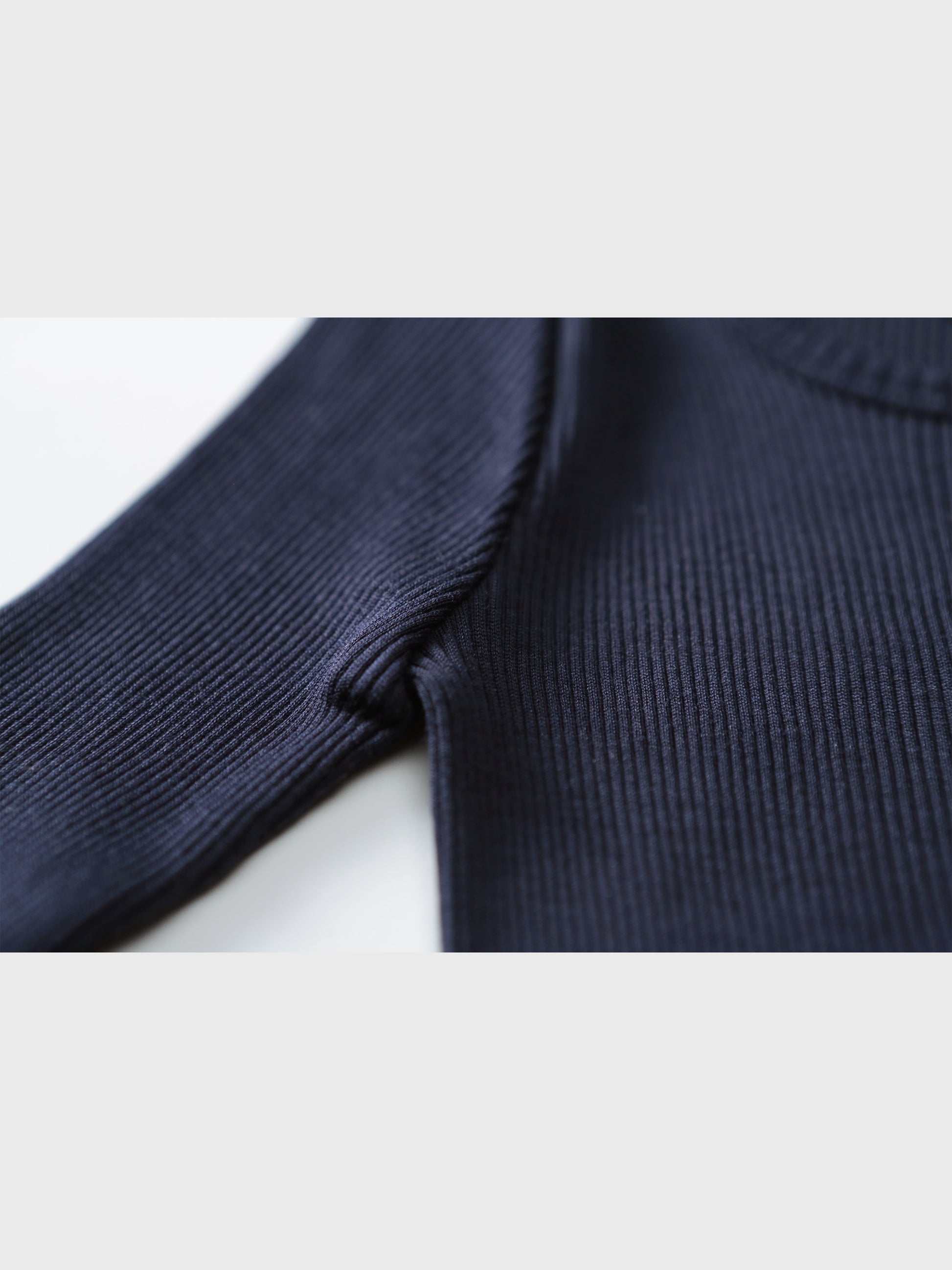 伸びの良いリブ生地で、脇に縫い目のない筒編みで仕立てているので、活発な子どもたちの動きを妨げません。