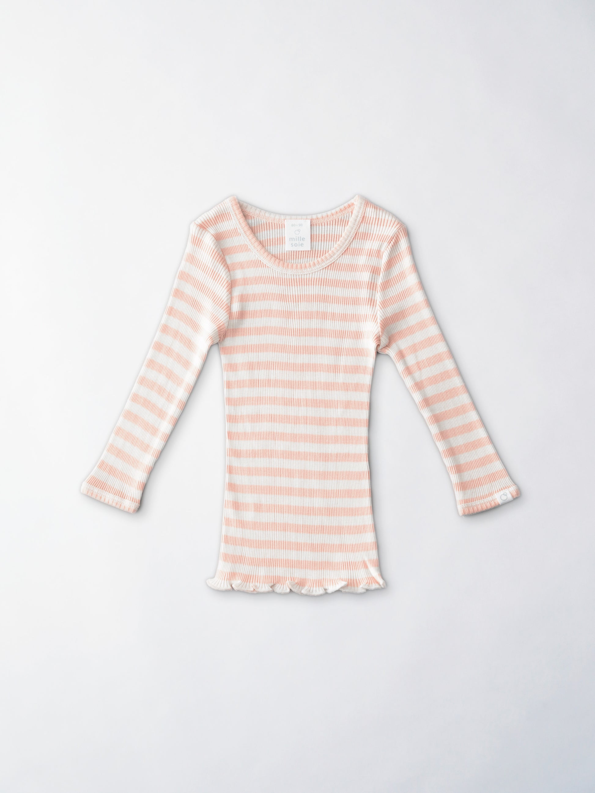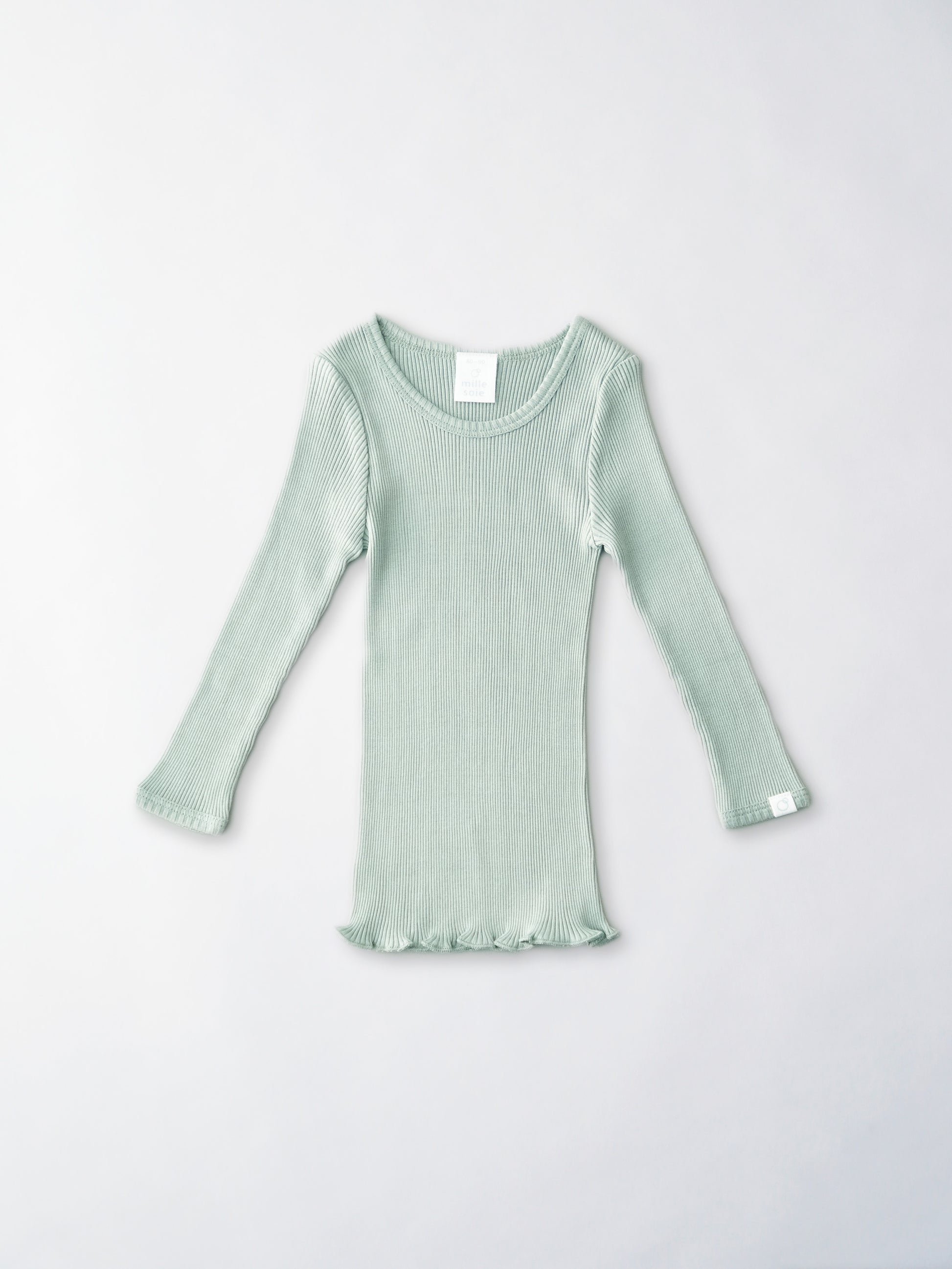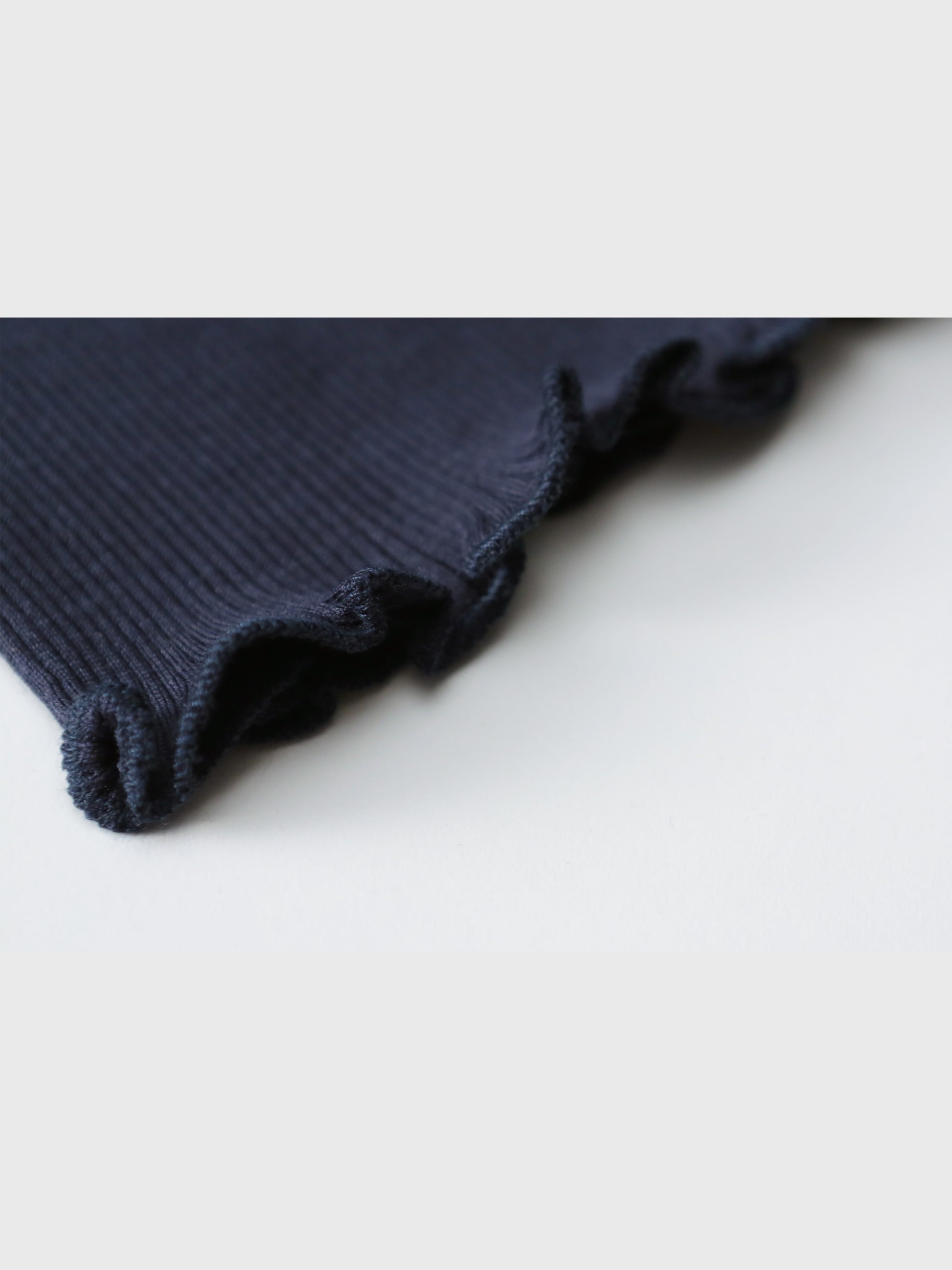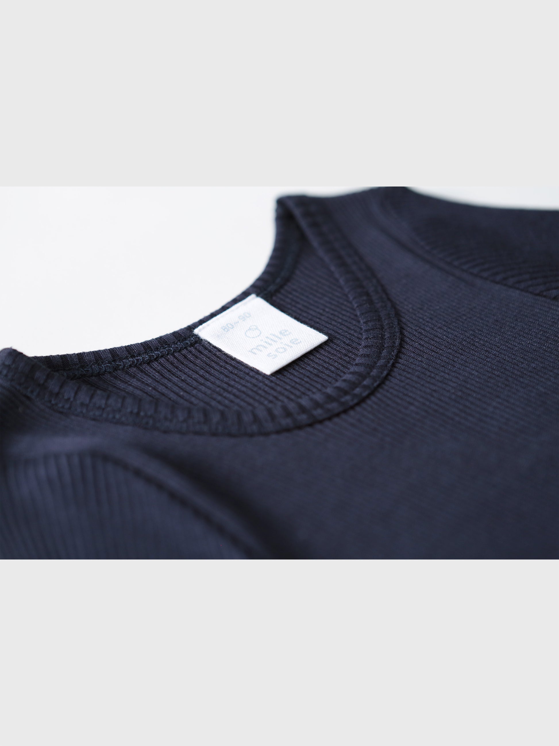 伸びの良いリブ生地で、脇に縫い目のない筒編みで仕立てているので、活発な子どもたちの動きを妨げません。